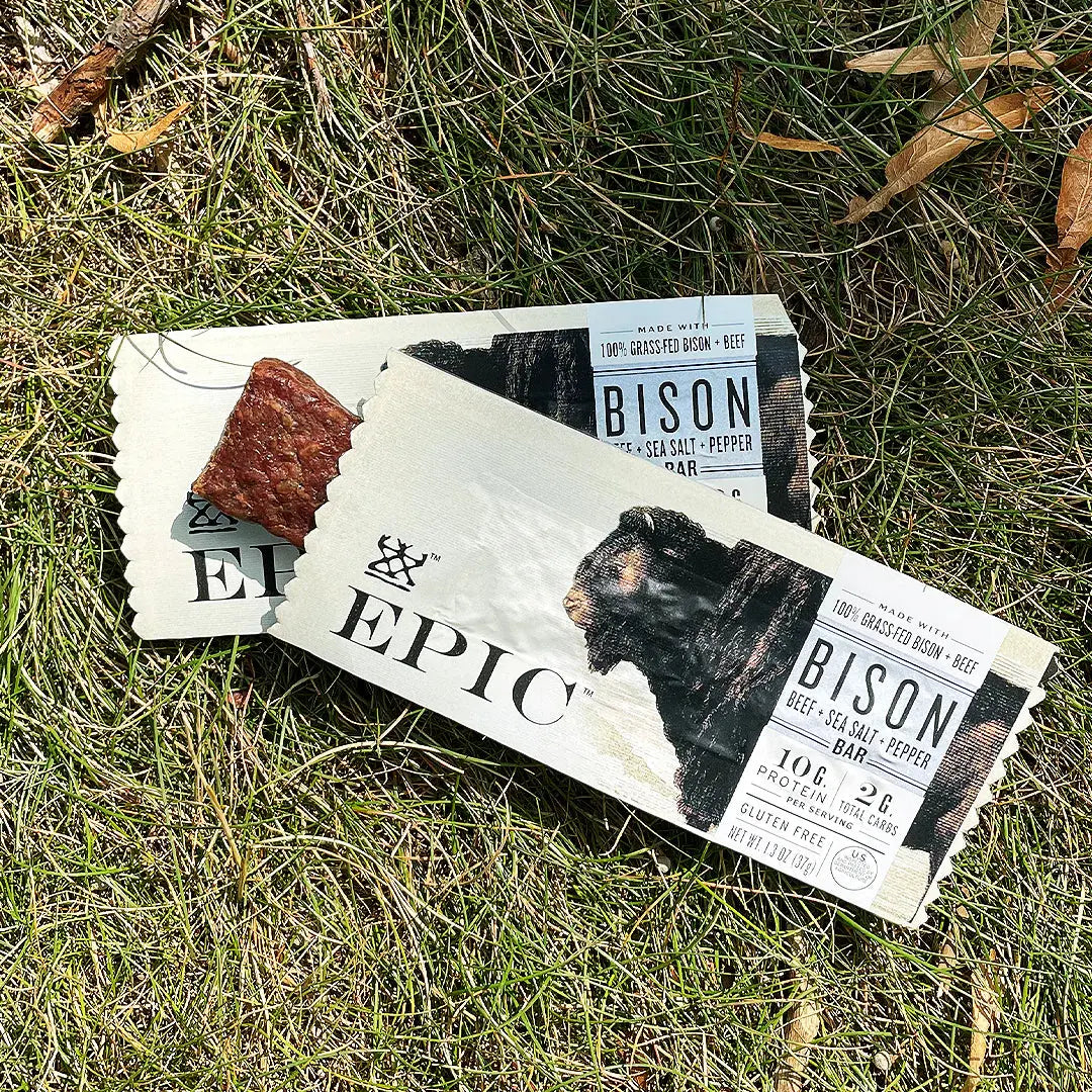 100% grass-fed bison. 100% grass-fed beef. 100% EPIC. The EPIC Grass-fed Bison Beef Sea Salt and Pepper Bar has 10g of protein and 2g of carbs for those who count that sort of thing.
