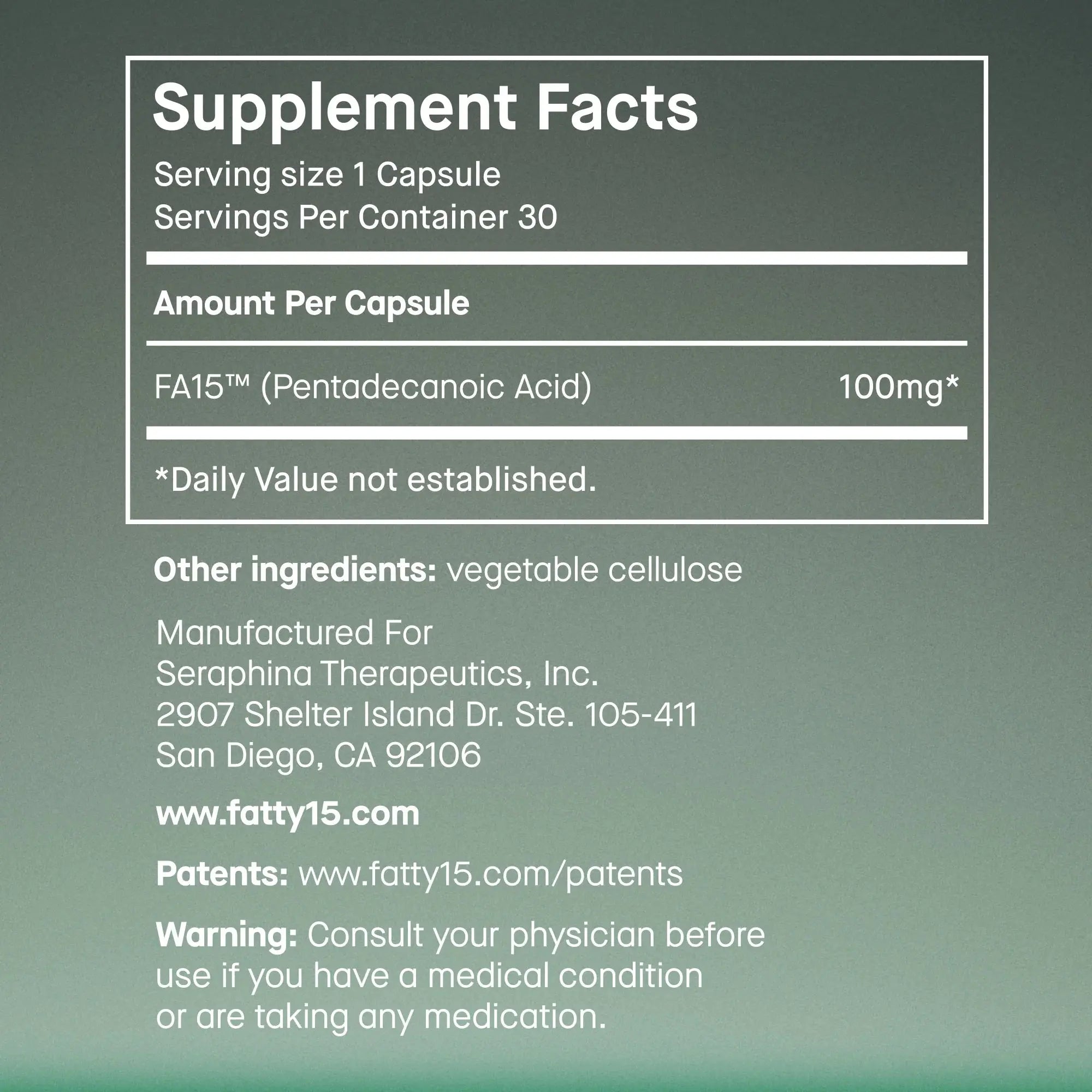 Fatty15 contains ONE ingredient-pure pentadecanoic acid (C15:0). Fatty15 is a science-backed, patented, award-winning, pure and vegan-friendly C15:0 supplement to support your long-term health and wellness.